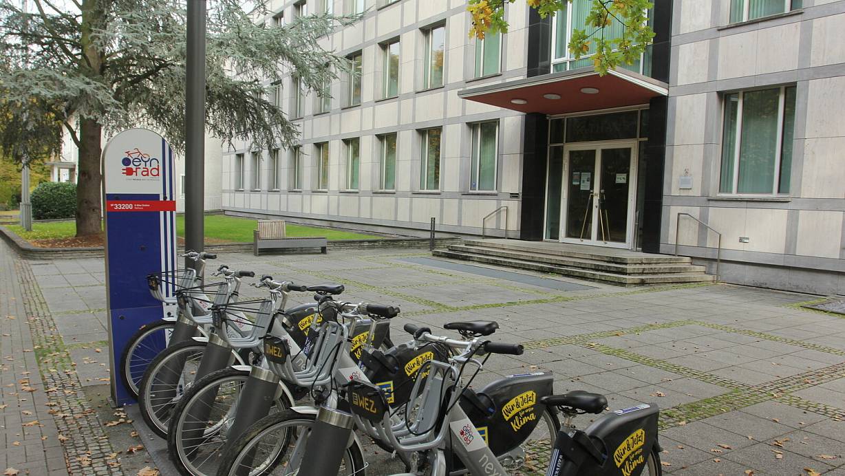 Die Verleihstation des Oeynrads vorm Rathaus. Nicht nur zum Zeitpunkt der Aufnahme ist der Fahrradständer hier gut belegt. | © Ulf Hanke