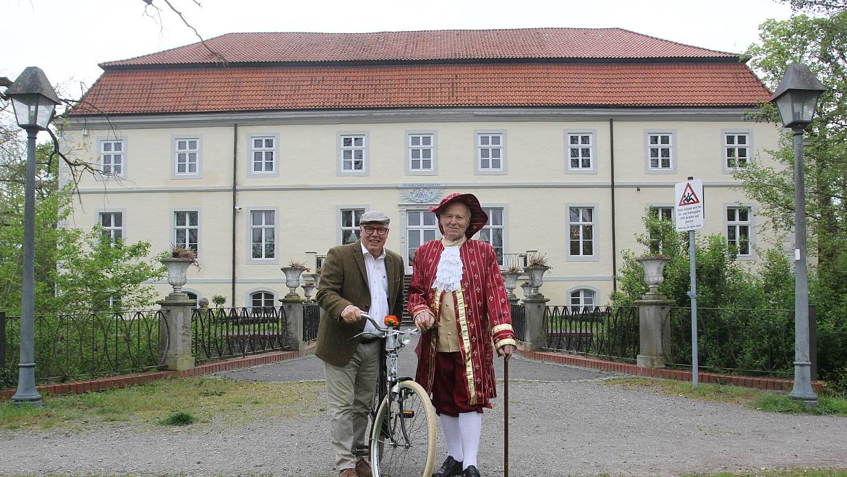 Dieter Obermeyer (l.) ist für den Tweed-Ride gewappnet, Dieter Büssing steht im Fantasie-Gewand des Wasserschloss-Erbauers Johann Friedrich von Weißenfels bereit. | © Ulf Hanke