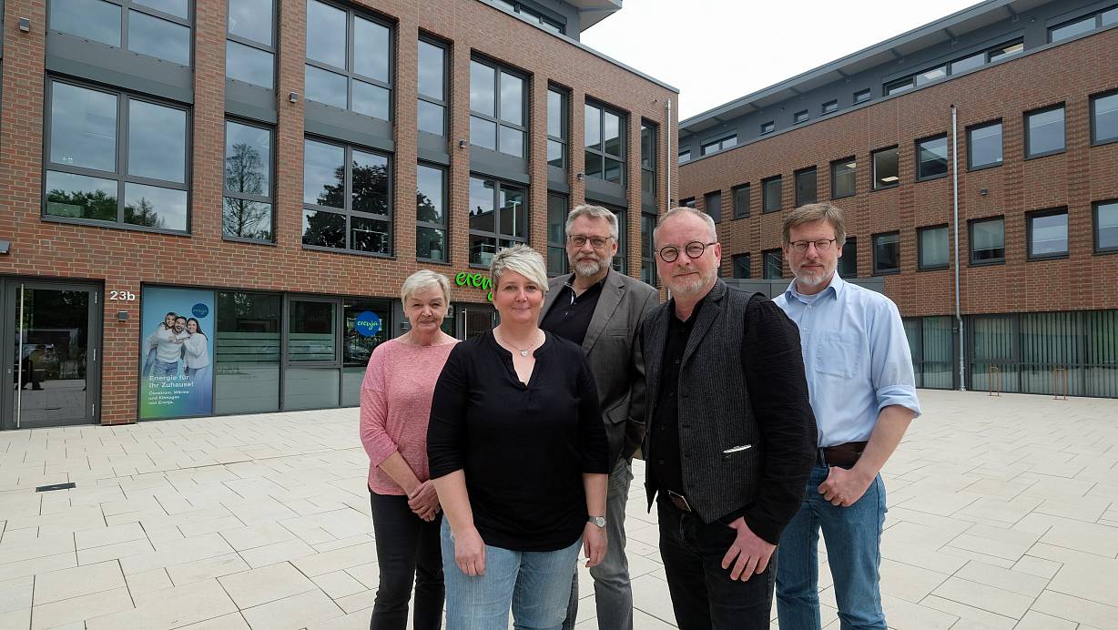 Die neuen Büros der NW-Lokalredaktion sind an der Heinrichstraße 23b. Redaktionsassistentin Silke Helwig (v. l.), die Redakteure Nicole Sielermann, Jörg Stuke, Thorsten Gödecker und Ulf Hanke kümmern sich um die Nachrichten aus der Kurstadt. Auf dem Foto fehlen Redakteurin Nicole Bliesener, Sportredakteur Jürgen Krüger und die Medienberater Oliver Gerhard und Cedric Jordan. | © Ingo Büchel