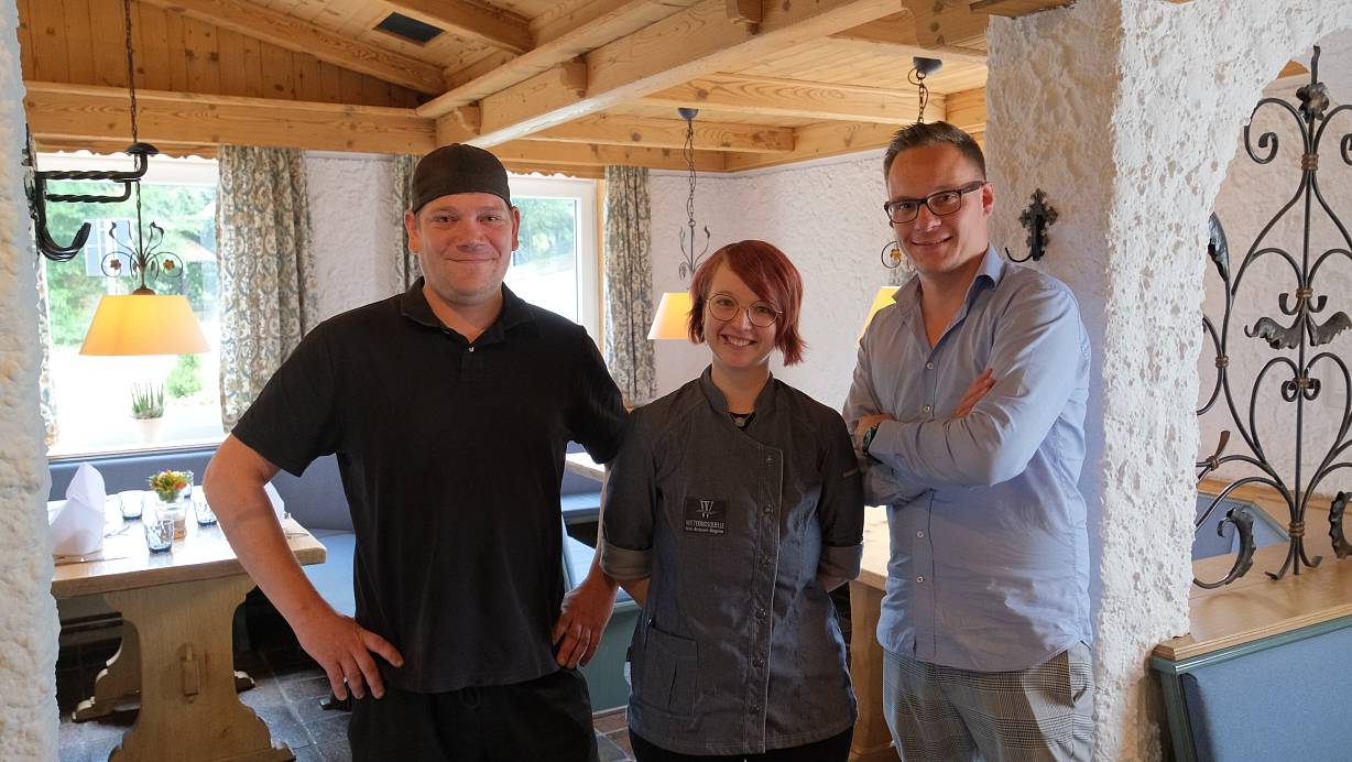 Verbinden klassische und moderne Küche: Das Team des Restaurants Wittekindsquelle um die beiden Küchenchefs Christian Taake (l.) und Laura Kosfeld sowie Betriebsleiter Moritz Weber. | © Nicole Bliesener