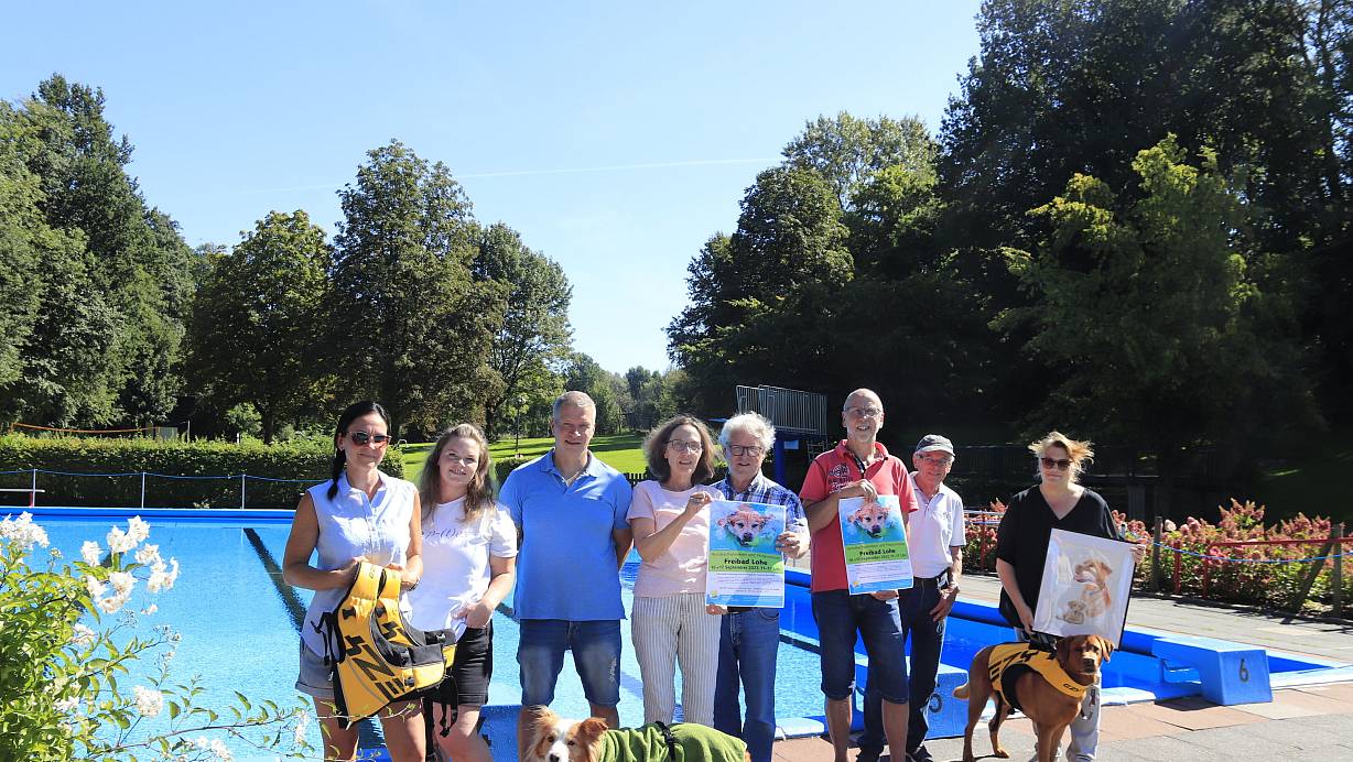 Die Hundephysiotheratpeutin Susanne Hamann (v.l.), Christina und Michael Kemner vom Familienunternehmen drop-tex, Doris und Heiner Unger, Wolfgang Möllers, Gerhard Weber als Mitveranstalter und Helfer sowie Daniela Stollberg, die Hundeportraits zeichnet, rechnen mit großem Andrang beim Hundeschwimmen. | © Emily Loose