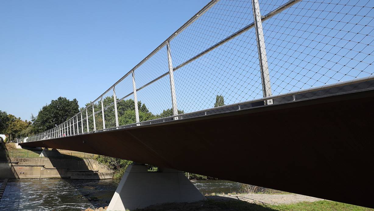 Ein Trog aus rostbraunem Cortenstahl und ein Edelstahlgeländer mit filgranem Geflecht bestimmen das Bild der Sielbrücke. | © Jörg Stuke