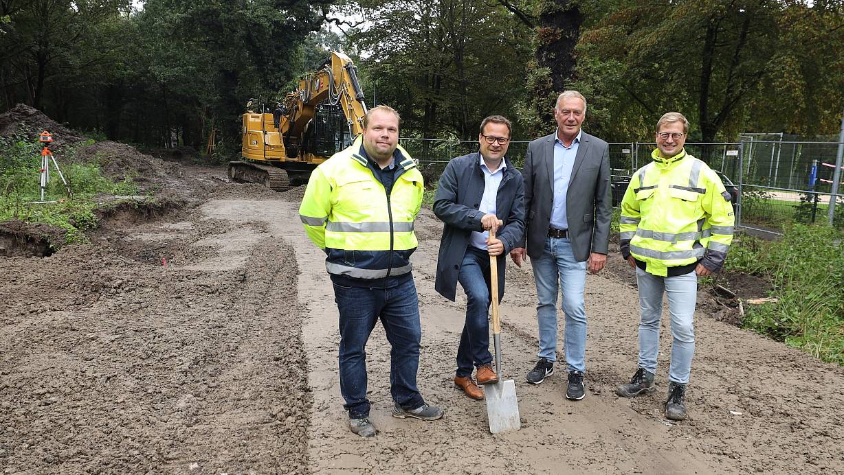 Mit dem symbolischen ersten Spatenstich starteten Bastian Kruse (v. l.), Lars Bökenkröger, Stefan Tödtmann und Jens Grove den Bau der Pumptrackanlage. Die Arbeit aber wird eher mit dem Bagger als mit dem Spaten zu erledigen sein. | © Jörg Stuke