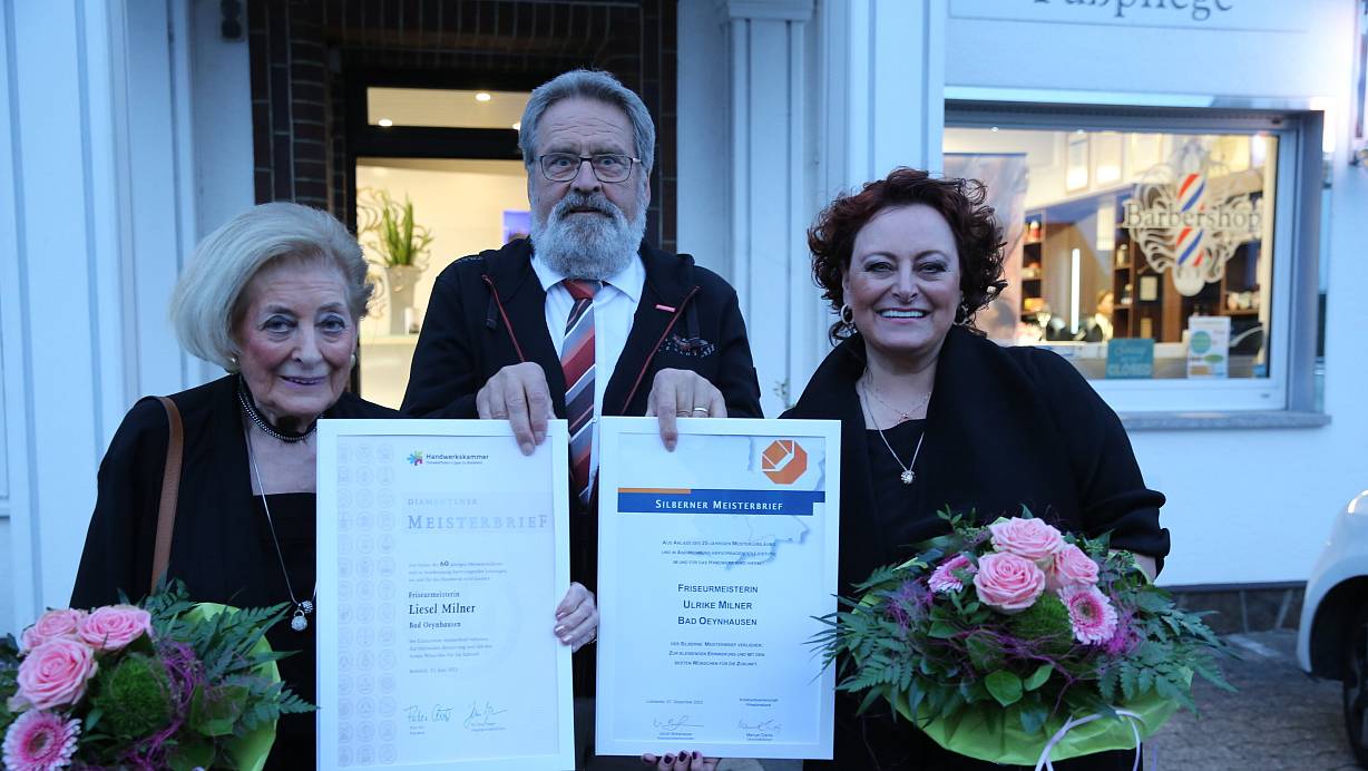Ehrenkreishandwerksmeister Karl Kühn überreicht die beiden Meisterbriefe an Liesel (l.) und Ulrike Milner. | © Elke Niedringhaus-Haasper