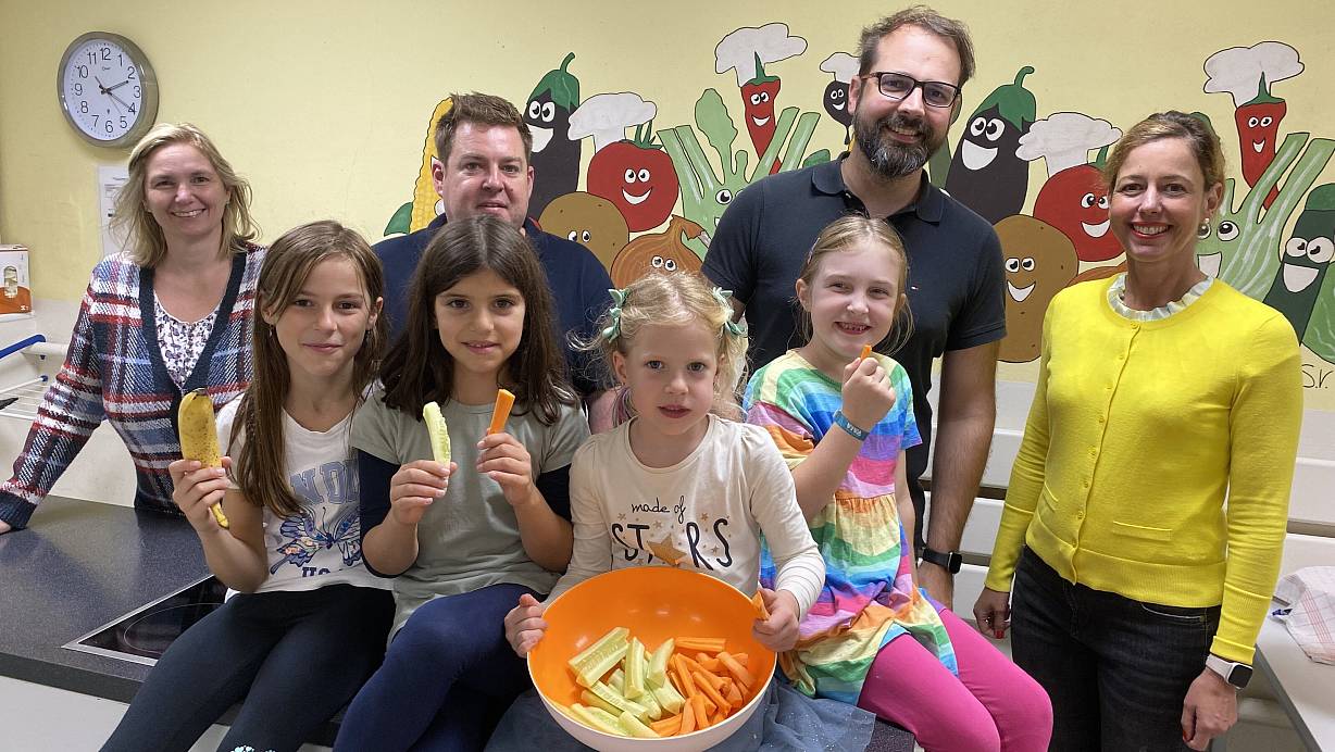 Emilie (vorne v. l.), Mila, Annie und Emma naschen von den Resten in der Schüssel. Aline Riebe, Sebastian Siek, Mark Kellermeier und Tanja Kienapfel freuen sich, dass es auch künftig gesund bleibt. | © Nicole Sielermann