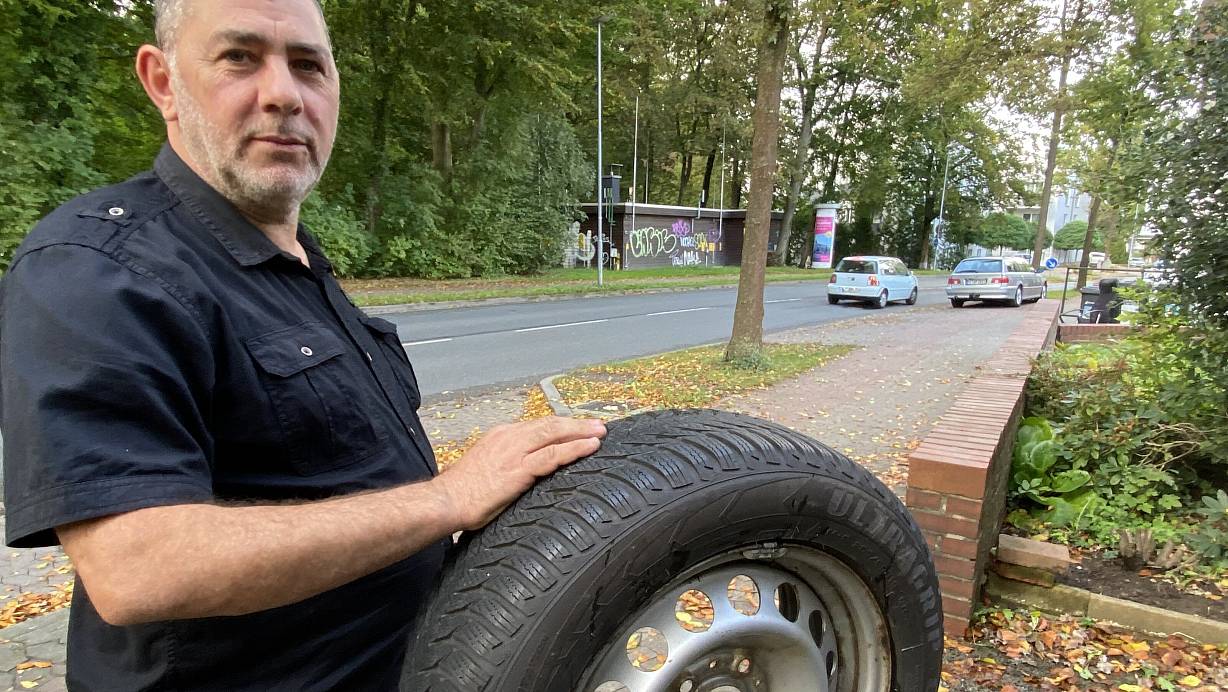 Jaafar Fakih ist sauer, denn immer wieder zerstören Unbekannte die Reifen der an der Steinstraße geparkten Autos. Nicht nur er, auch Nachbarn und Besucher sind betroffen. Noch hat er ein Ersatzrad parat. | © Nicole Sielermann