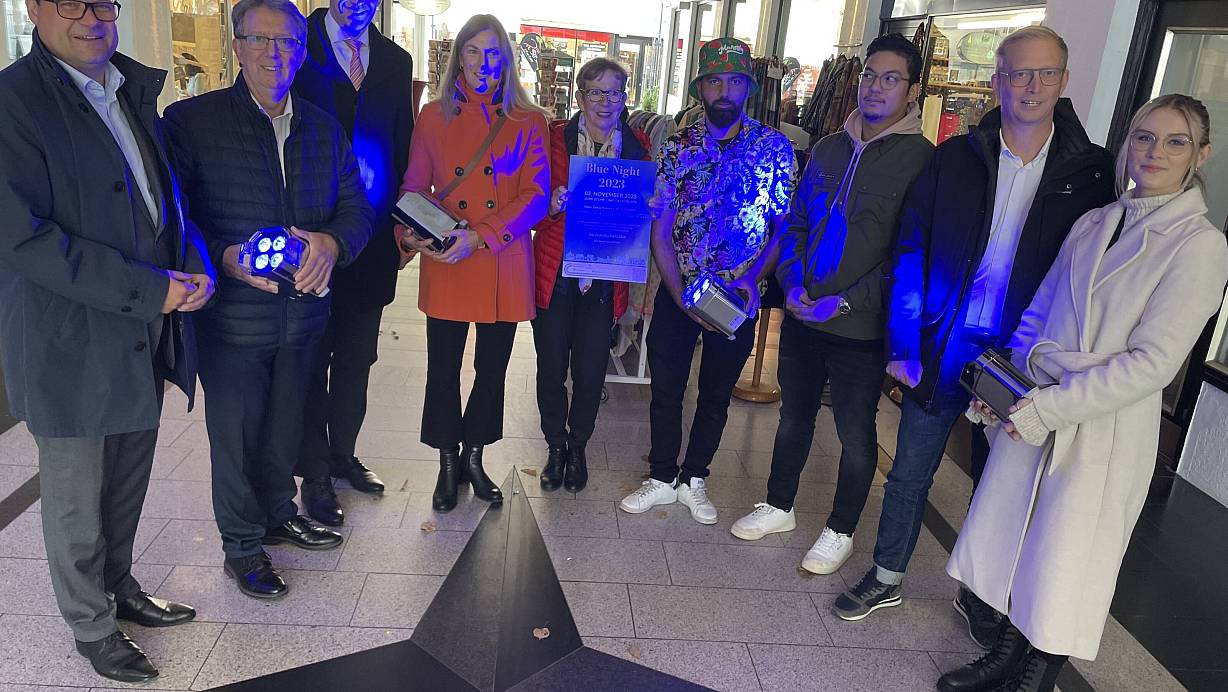 Optimistisch, dass die Blue Night ein voller Erfolg wird, sind Bürgermeister Lars Bökenkröger (v.l.), Andreas Kelch (Volksbank), Matthias Paschke (Stadtsparkasse), Beate Krämer (Staatsbad), Hannelore Arndt (Initiative Bad Oeynhausen), Mohammed Khodeir (Mahalo), Barnd Duong (Villa Q), Tim Schütte (Initiative Bad Oeynhausen) und Selina Sudermann (Porta-Event). | © Elke Niedringhaus-Haasper