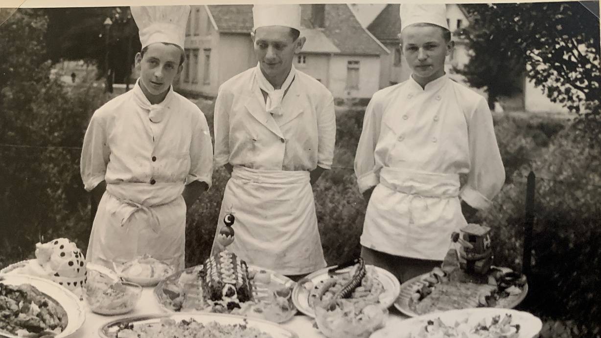 Ein Bild aus den 1950er Jahren: Der Küchenchef des Hotel Meyer, Hans Languth (Mitte), Lehrling Albert Wegener (r.) und ein Kochgeselle, der aus Recklinghausen stammte. | © Privat