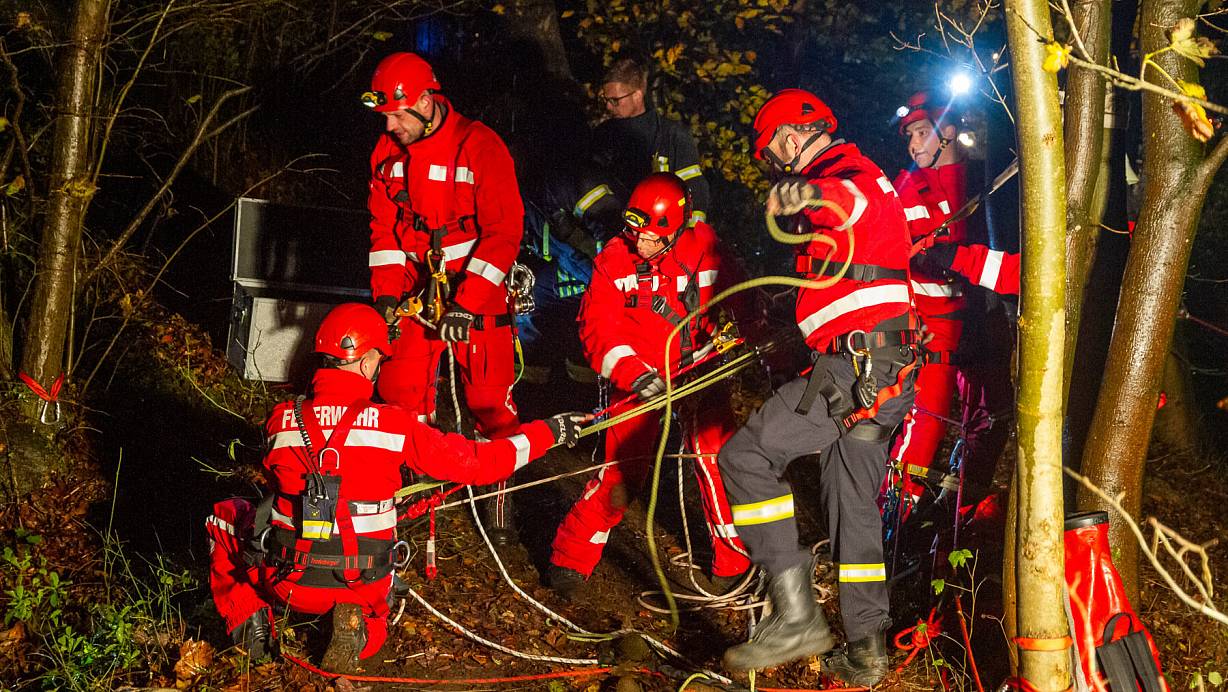 Drei Abenteurer machen in einen Schacht eine gruselige Entdeckung und alarmieren die Polizei. Höhenretter der Feuerwehr bergen eine Plastiktüte.