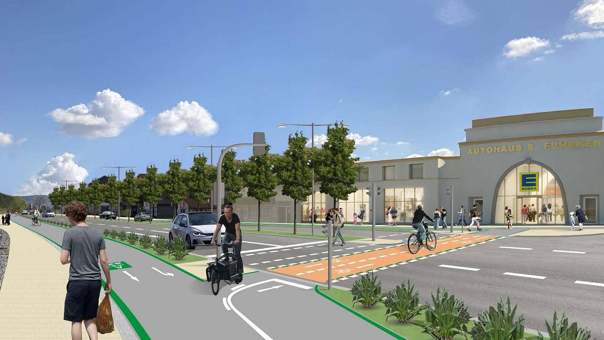 Die Einmündung der Herforder Straße auf die Mindener Straße ist ein zentraler Punkt der Planung. Hier teilt sich der Radschnellweg, der aus Richtung Westen kommend bis dahin nur auf der Nordseite geführt wurde, auf beide Straßenseiten auf. Optimistisch ist in der Visualisierung auch schon das E-Center auf dem Fuhrken-Gelände realisiert. Visualisierungen: L. Schumacher/Stadt Bad Oeynhausen | © Stadt Bad Oeynhausen