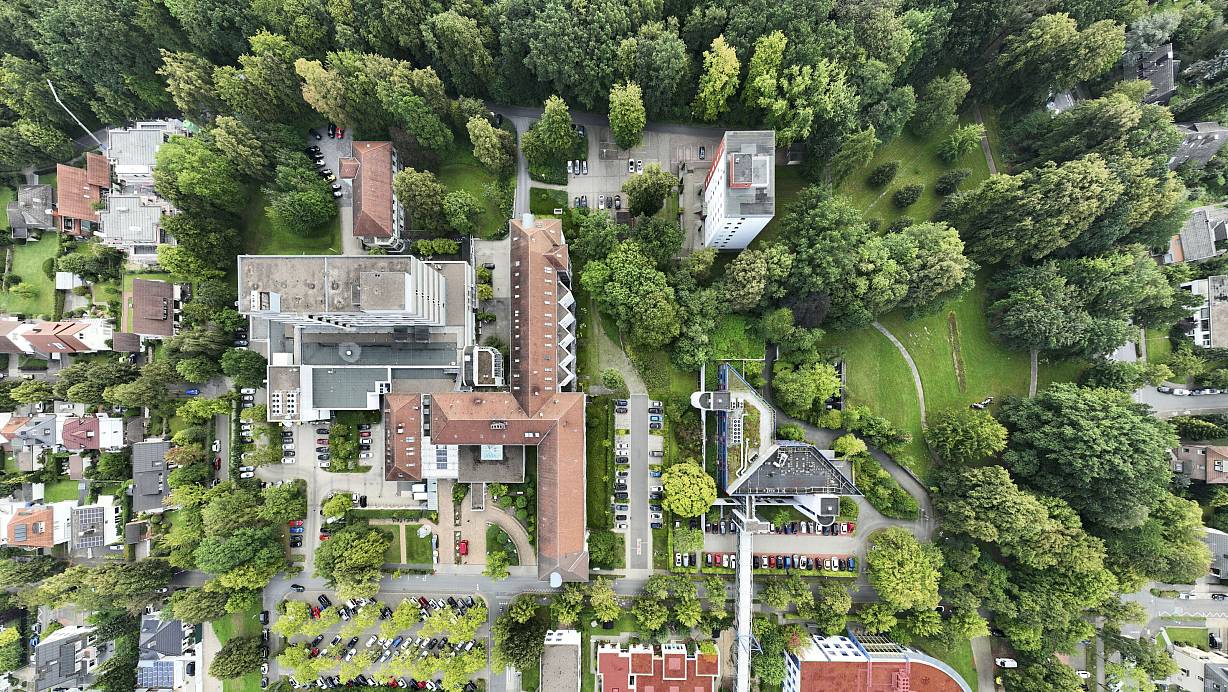 Wenn die Mühlenkreiskliniken ihre Pläne zur Umstrukturierung der Kliniklandschaft umsetzen, wird das Herz- und Diabeteszentrum voraussichtlich eine Geburtsklinik unmitelbar neben der Kinderherzklinik (rechts mit rot markiertem Dach) bauen. Dafür müsste wahrscheinlich die Kita Rappelkiste (links daneben) weichen und an anderer Stelle neu gebaut werden. Links oberhalb der Rappelkiste steht das Krankenhaus. | © THORSTEN ULONSKA
