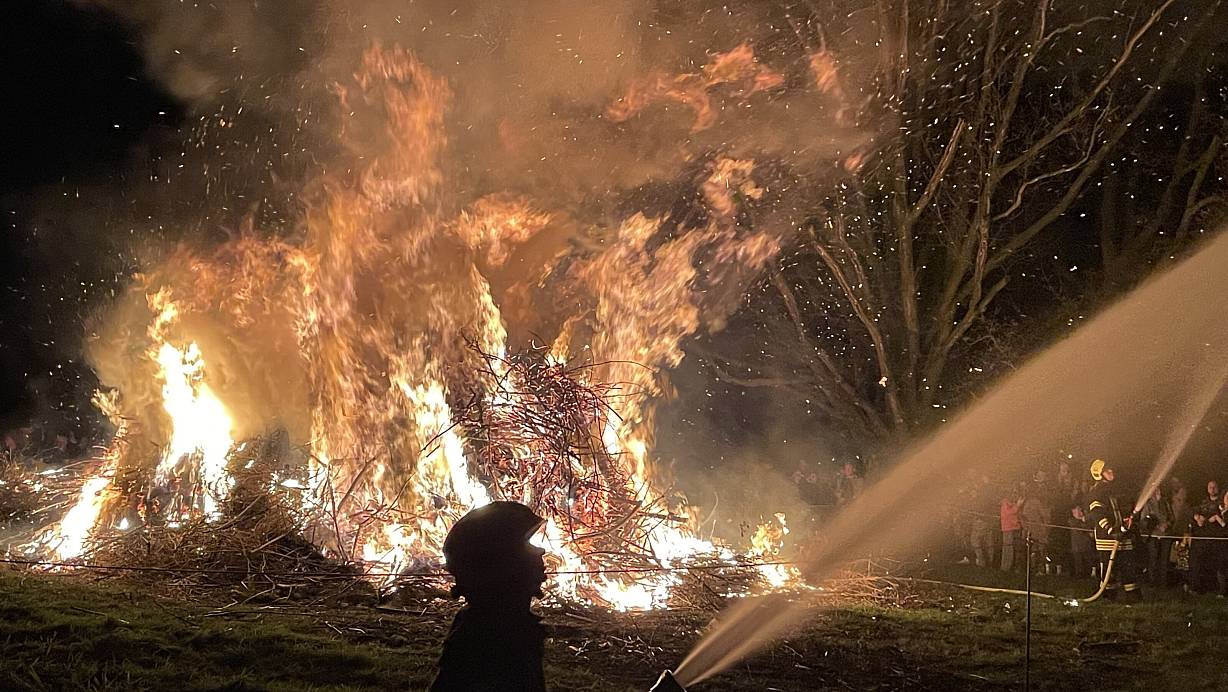 Als es auf der Lohe stockdunkel ist, entzünden die Besucher ein mächtiges Osterfeuer. Damit die Flammen nicht auf die umliegenden Bäume übergreifen, halten Brandbekämpfer Wasserpistolen auf die Äste. | © Elke Niedringhaus-Haasper