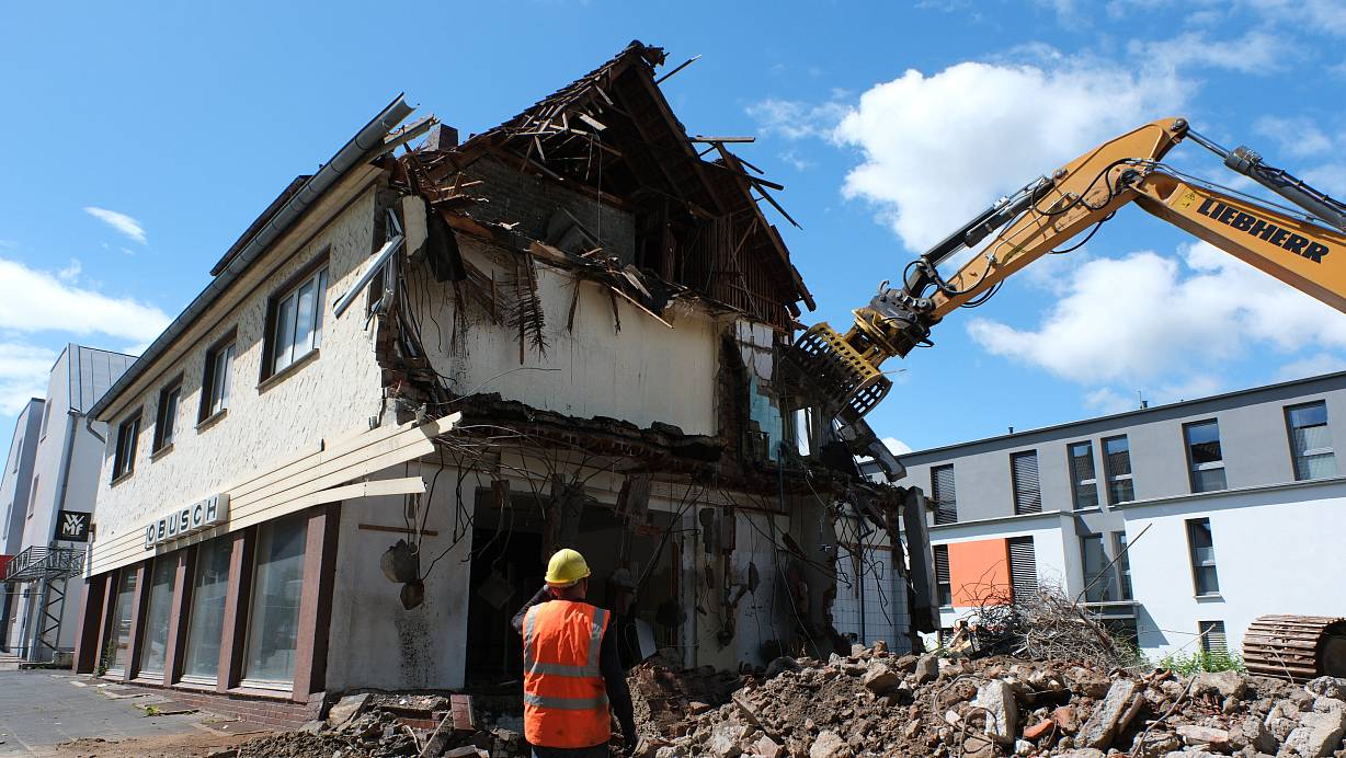 Andreas Scheding und Markus Talagar im Bagger reißen das ehemalige Haushaltswarengeschäft ab. | © Ulf Hanke