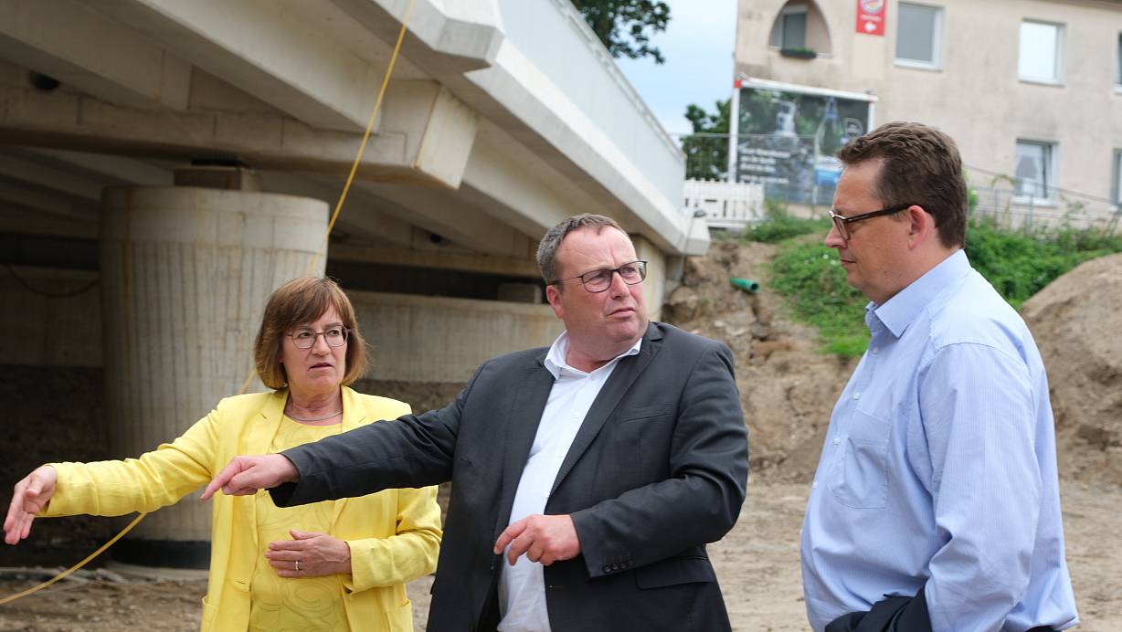 Petra Beckefeld (v.l.), Oliver Krischer und Stefan Schwartze im Gespräch auf der Flutmulden-Brückenbaustelle. | © Ulf Hanke