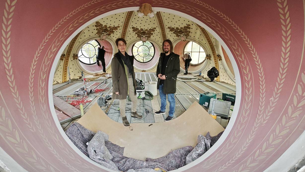 Staatsbad-Betriebsleiter Stefan Meyhöfer (r.) und Architektin Elke Zeise zeigen den Neubau der Kuppelfenster im Achteck auf dem Badehaus II. | © Ulf Hanke