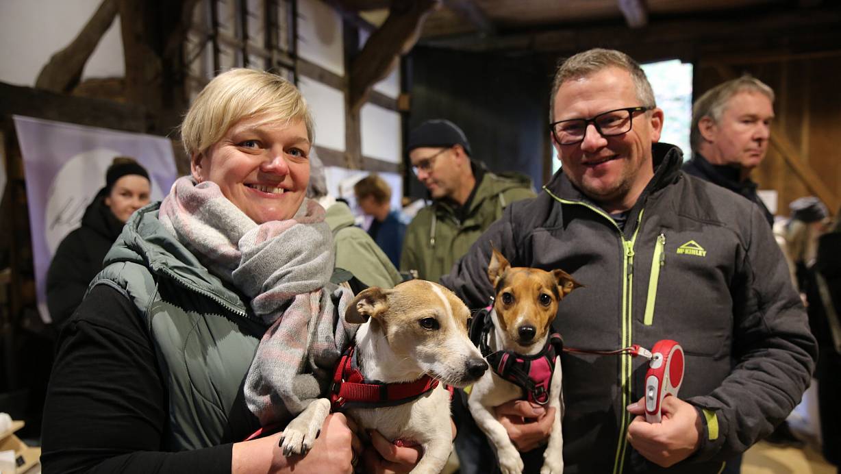 Katja Albrecht und Martin Schlottmann tragen ihre beiden Jack Russel Hunde Mila und Mali vorsorglich durch ads Gedränge im Scheunenhaus. | © Elke Niedringhaus-Haasper