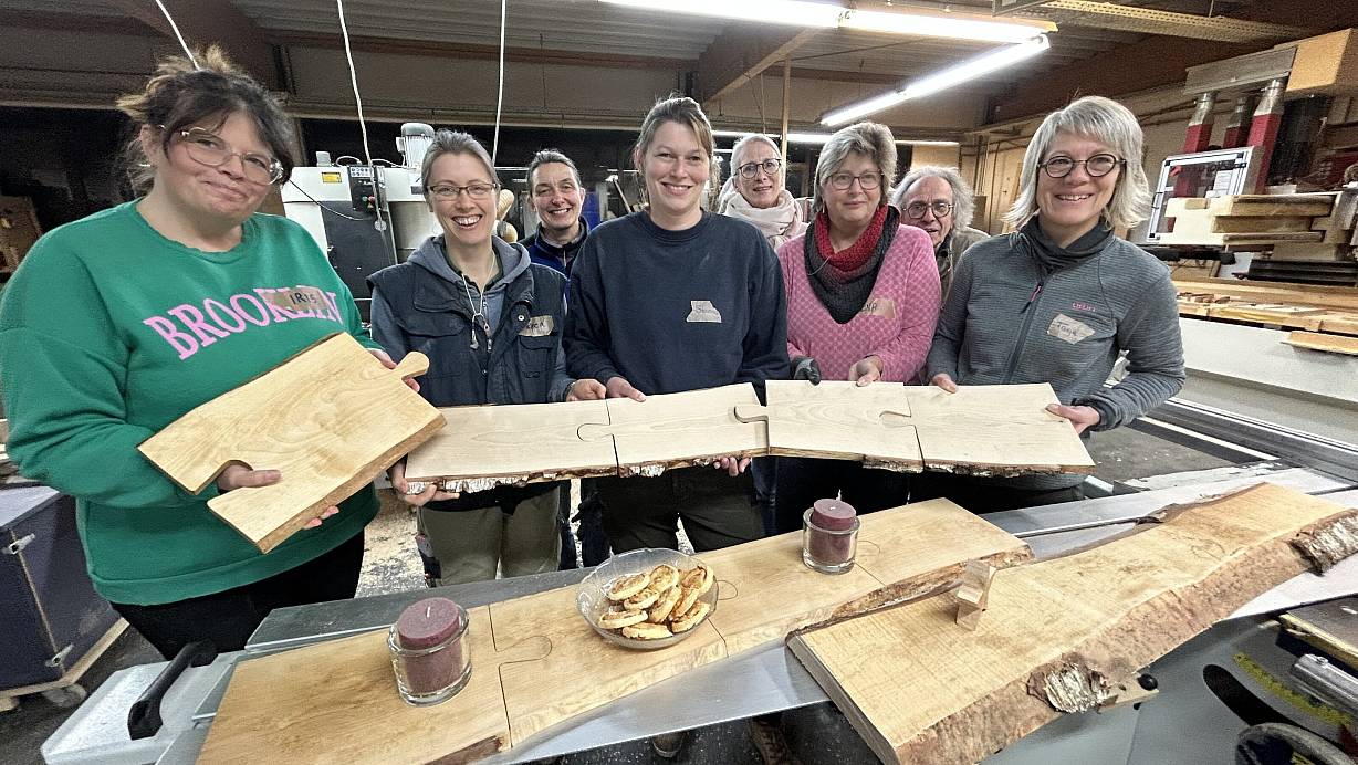 Meisterlich haben die Teilnehmerinnen des Workshops die Aufgabe absolviert. Aus einer Birkenbohle haben sie in Handarbeit ein meterlanges Servierbrett gezaubert. | © Nicole Sielermann