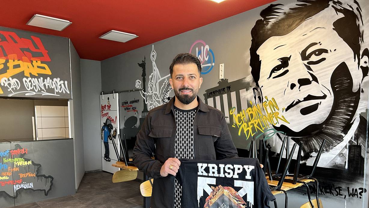 Mahmoud Rasho zeigt die T-Shirts, die seine Mitarbeiter und er im neuen Szene-Restaurant tragen werden. Krispy Kebab eröffnet am 2. April in der Kurstadt. | © Nicole Sielermann