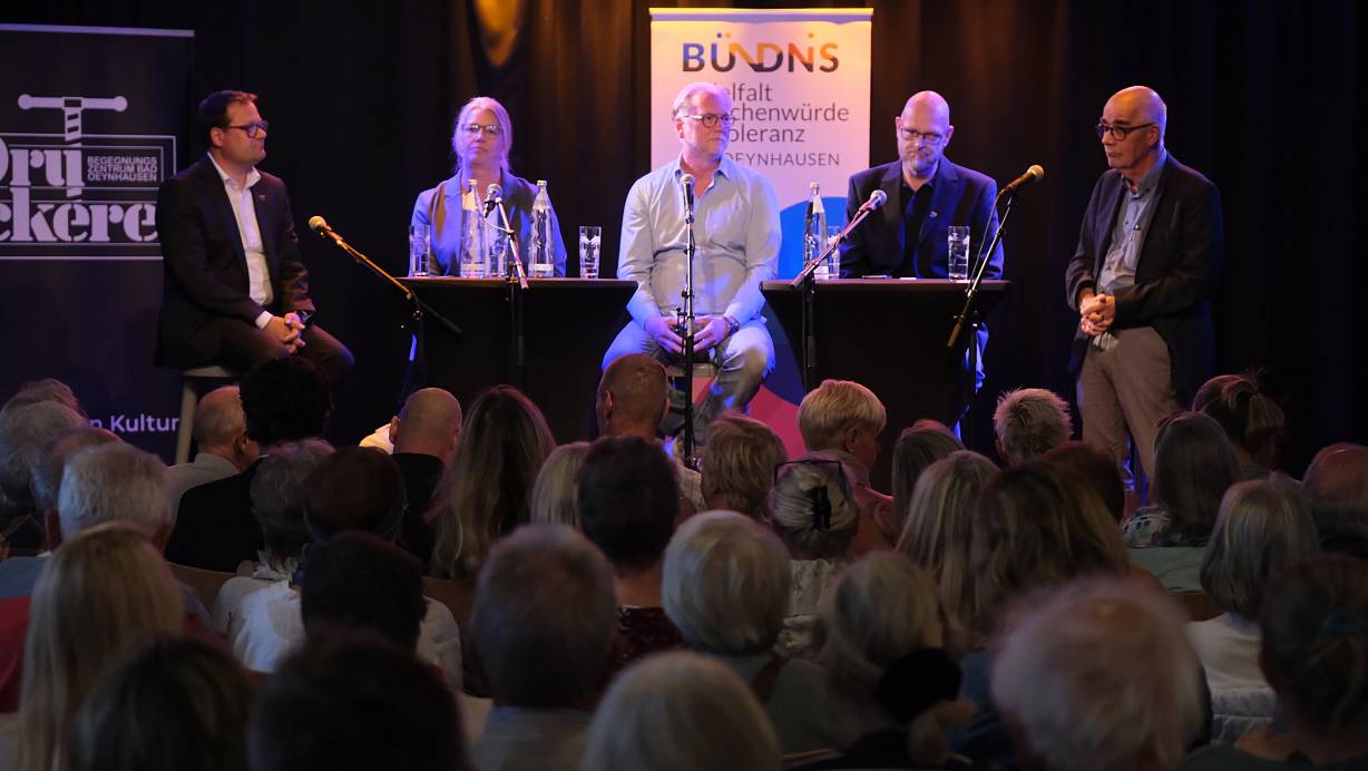 Auf Einladung des Bündnisses für Vielfalt, Menschenwürde und Toleranz erläutern die Bewerber ihre Positionen. Rund 200 Menschen hören in der Druckerei zu.