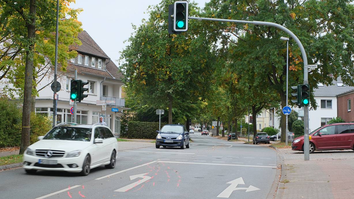Ein 78-jähriger Radfahrer ist beim Zusammenstoß mit einem Lieferwagen auf Höhe der Fußgängerampel an der Steinstraße, Ecke Portastraße gestürzt und lebensgefährlich verletzt worden. | © Ulf Hanke