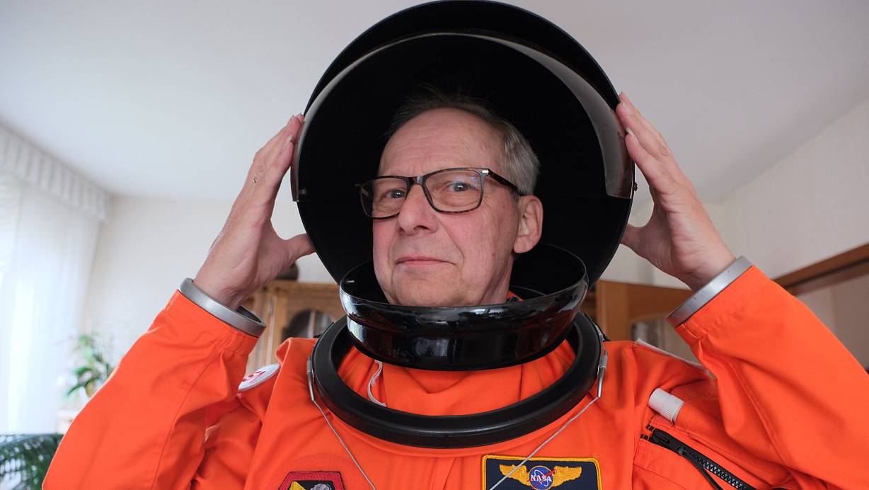 Horst Paczkowski zwängt sich fürs Foto in die Dienstkleidung der Astronauten des Space Shuttles. | © Ulf Hanke