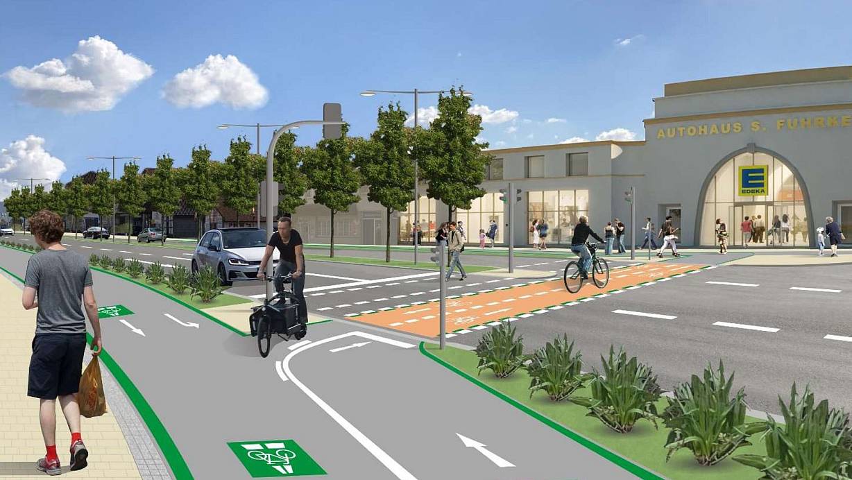 So soll die Mindener Straße vorm ehemaligen Autohaus Fuhrken in Zukunft aussehen. Wann diese Zukunft beginnt, ist aber weiter unklar. | © Stadt Bad Oeynhausen