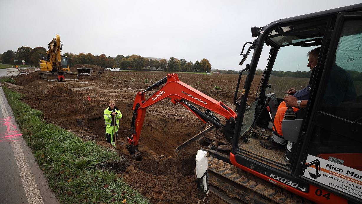 Polier Peter Friede (im Bagger) und Veith Wüllner arbeiten an der Trasse für den neuen Bürgerradweg zwischen Bergkirchen und Wulferdingsen. | © Jörg Stuke