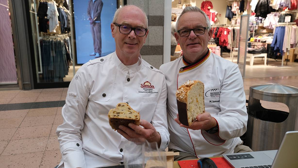 Prüfer Michael Insensee (r.) hält seinen persönlichen Favoriten in der Hand - den Panetone aus der Backstube von Arno Simon (l.). | © Nicole Bliesener