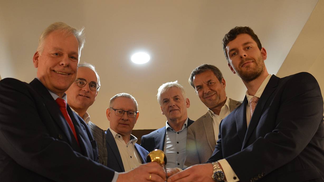 Vater Henrik Pott (l.) und sein Sohn Patrick halten den goldenen Apfel. Dazwischen: Die Vertreter des WirtschaftsClubs Bad Oeynhausen Volker Nolting, Carsten Rosenberg, Peter Kögel, Michael Ruprecht. | © Justus Rahn
