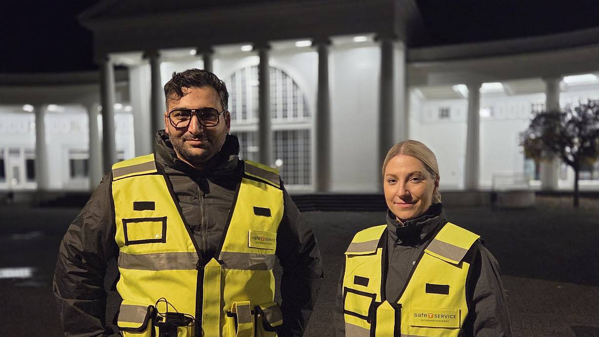 Wachdienst im Kurpark: Revaz Advoyan (31, links) und Michelle Jostmeier (29) organisieren und zeigen Präsenz – Teil ihres Jobs. Nicht im Bild: Oliver Schuhmann (22) | © Justus Rahn