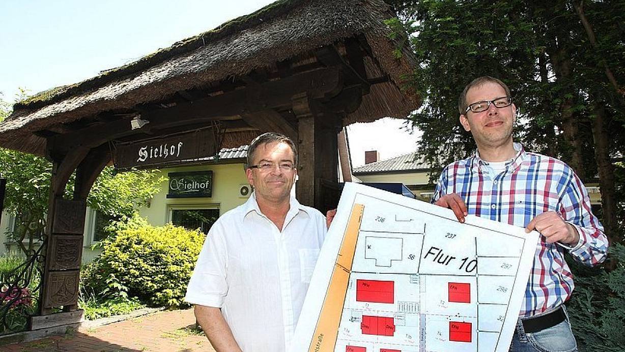 Denn an der Stelle des alten Sielhofs soll ein Wohnpark entstehen. So plant es der Käufer - die Garen und Bartsch Immobilien GbR. "Auf dem 4.400 Quadratmeter großen Grundstück entstehen Bauplätze", erläutert Thomas Garen das Konzept. Ein Mehrfamilien-, ein Doppelhaus- sowie fünf frei planbare Einfamilienhäuser sollen dort in nächster Zeit entstehen.