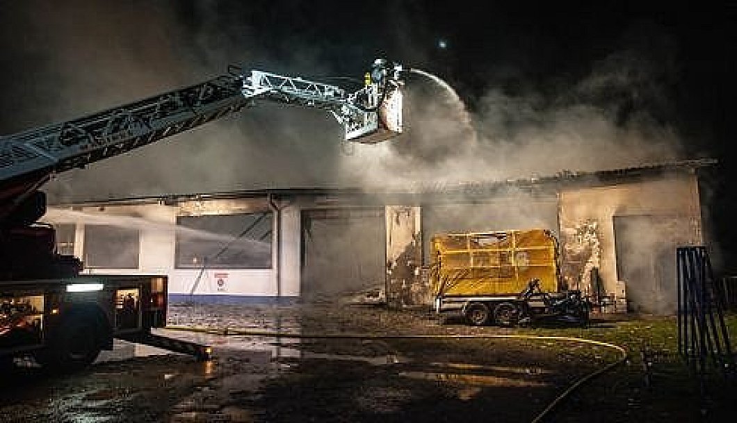 Schon auf der Anfahrt konnten die Einsatzkräfte das Feuer des vollständig in Flammen stehenden Gebäudes erkennen. Windböen fachten das Feuer zusätzlich an. Zur Brandbekämpfung der rund 1.500 Quadratmeter großen Lagerhalle waren knapp 100 Personen der umliegenden Feuerwehren im Einsatz.