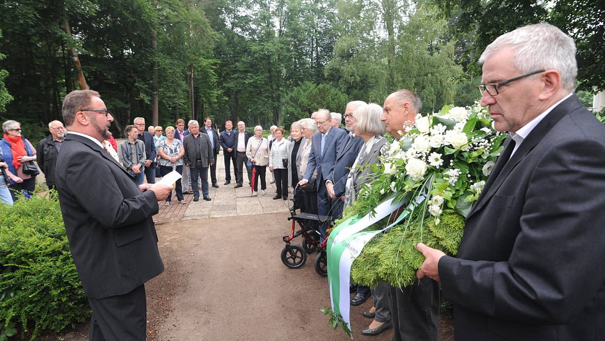 Gedenkfeier für Wilhelm Kern: Wilfried Windhorst (vorne, ganz r. ) und neben ihm Reinhard Bösch tragen den Kranz. Links neben Bösch sind die Kinder Kerns, Tochter Gerhild Halfmeier und Ernst-Ulrich Kern, zu erkennen, daneben stehen Ehrenbürger Horst Eller und Gattin Brigitte. Die Gedenkrede hält Bürgermeister Heinrich Vieker. ? | © Foto: Joern Spreen-Ledebur