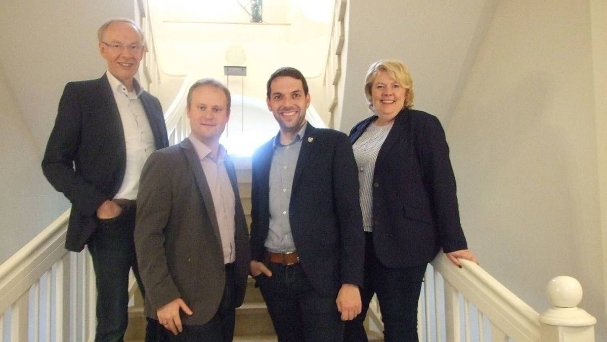 Die CDU-Mitglieder haben am 27. November die Wahl zwischen zwei Kandidaten, die sich für die Nachfolge von Bürgermeister Heinrich Vieker interessieren. Detlef Beckschewe,Stadtverbandsvorsitzender (l.) und Anja Kittel (r.) stellten am Samstagnachmittag im Schloss Benkhausen nach eine Klausurtagung von Stadtverband und Fraktion Henning Vieker (2. v.l.) und Thomas Rogalske (2. v. r.) vor. | © Karsten Schulz