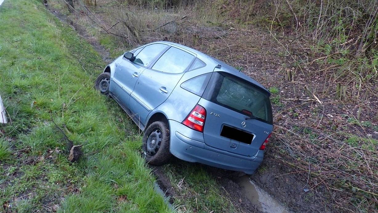 Der Mercedes geriet auf gerader Strecke auf den Grünstreifen und dann in den Graben. | © Polizei Minden-Lübbecke