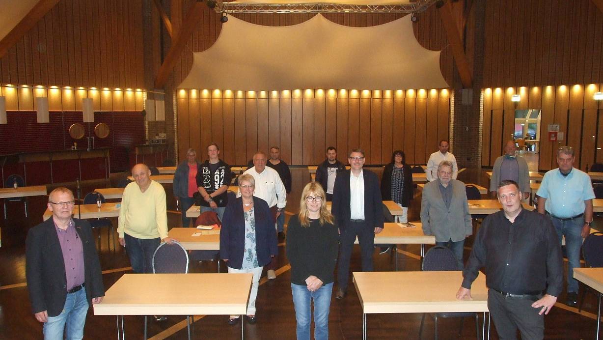 Die SPD-Kandidaten und Kandidatinnen für die Stimmbezirke stellten sich nach der Mitgliederversammlung im großen Bürgerhaussaal in Corona-Sellung auf. | © Karsten Schulz