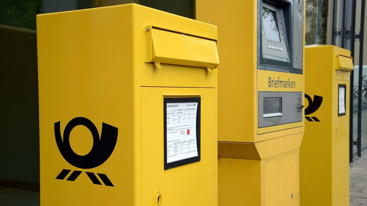 Gelber Briefkaesten mit Posthorn und gelber Briefmarkenautomat am Eingang einer Postfiliale in Freiburg am 03.05.2015.Foto: Winfried Rothermel | Verwendung weltweit | © Verwendung weltweit