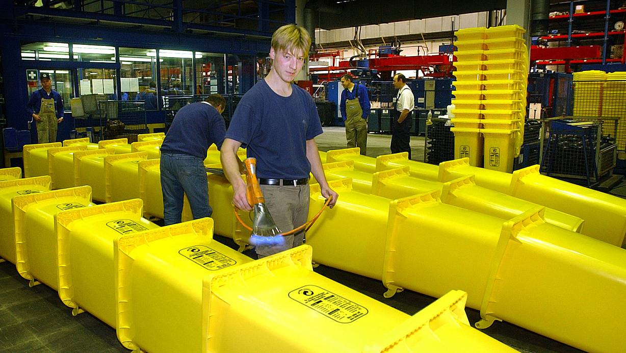Die gelben Mülltonnen werden in Herford bei Sulo produziert. Ab 1. Januar stehen sie auch auf den privaten Espelkamper Grundstücken. | © Frank-Michael Kiel-Steinkamp