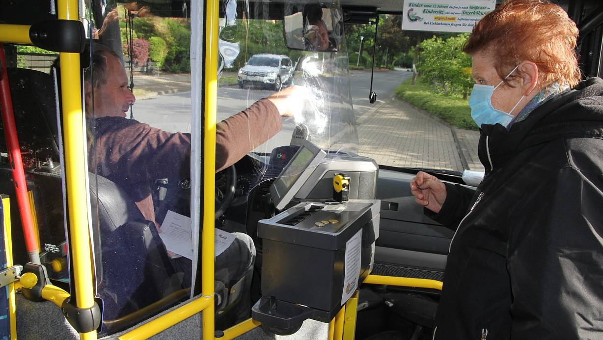 Karola Klaus löst bei Joachim Snethlage ihre Fahrkarte. Sie war der erste Fahrgast im Bürgerbus nach der Corona-Pause. | © Klaus Frensing (Archiv)