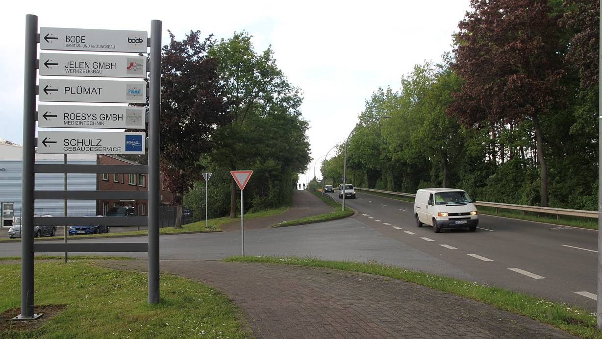 Die Ortstafel an der General-Bishop-Straße soll zukünftig an der Einmündung zur Dr.-Max-Ilgner-Straße stehen, so dass die Radler in Richtung Westen auf dem Radweg fahren müssen. | © Klaus Frensing