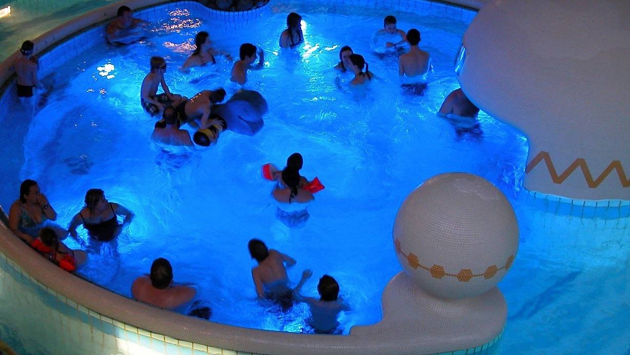 Das Spaßbecken wrd vor allem von Jugendlichen genutzt und wird imemr in ein ganz bsonderes Licht getaucht, das eine besondere Stimmung erzeugt. | © Aquapark Management