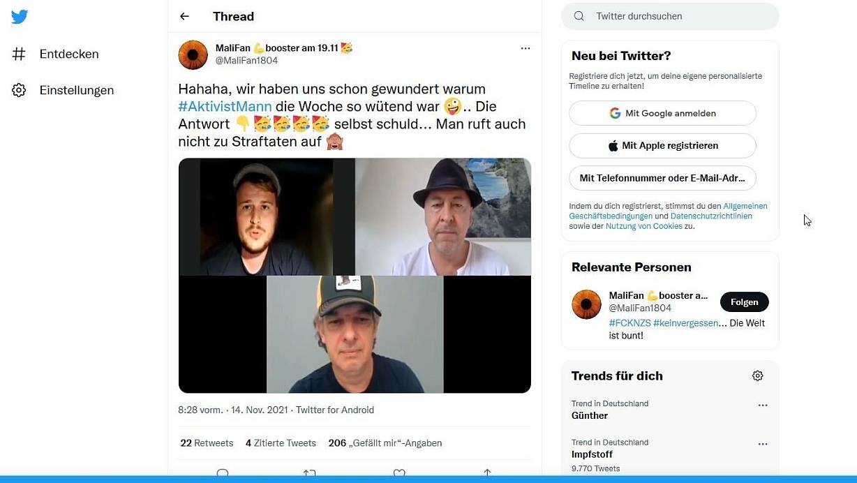 Auf Twitter beklagt der rechte Youtuber Matthäus Westfal (oben l.) sich über eine Hausdurchsuchung bei ihm in Espelkamp. Rechtsanwalt Gordon Pankalla (u.), wird von Oliver Janich (r. oben) gebeten, den Sachverhalt juristisch einzuordnen. | © Frank Hartmann