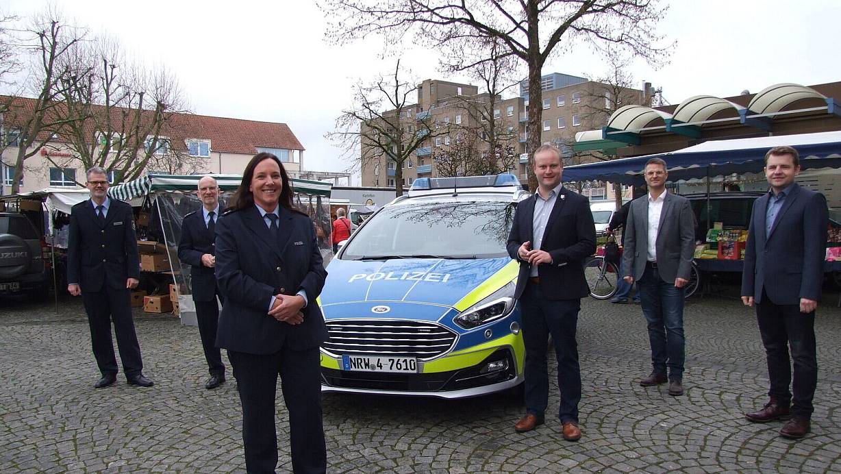 Daniela Krato wird umrahmt von männlichen Kollegen und den Harren der Espelkamper Stadtverwaltug mit Sven-Otto Deubel (v.l.), Mathias Schmidt, Polizeileiter Minden-Lübbecke, Bürgermeister Henning Vieker, Marco Hennig, Ordnungsamtsleiter und Matthias Tegeler (Fachbereichsleiter). | © Karsten Schulz