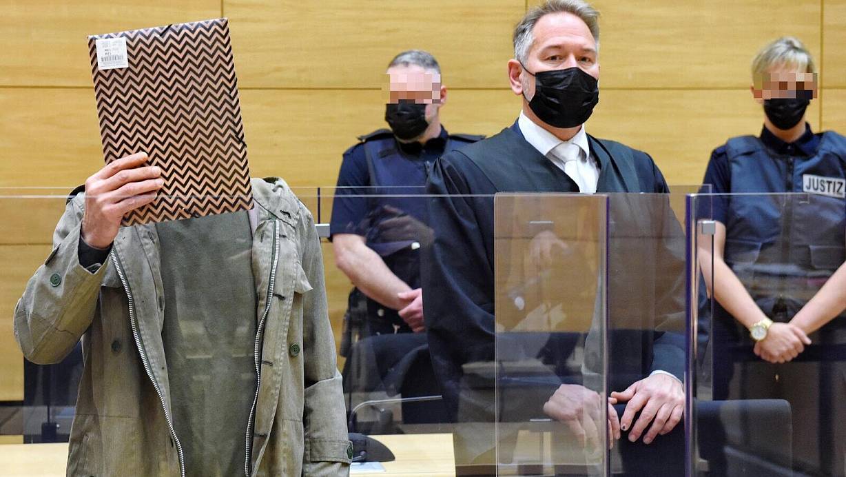 Ercan K, der sich hier am ersten Verhandlungstag eine Akte vor das Gesicht hält, steht wegen des Tatvorwurfs des zweifachen Mordes vor Gericht. | © Barbara Franke