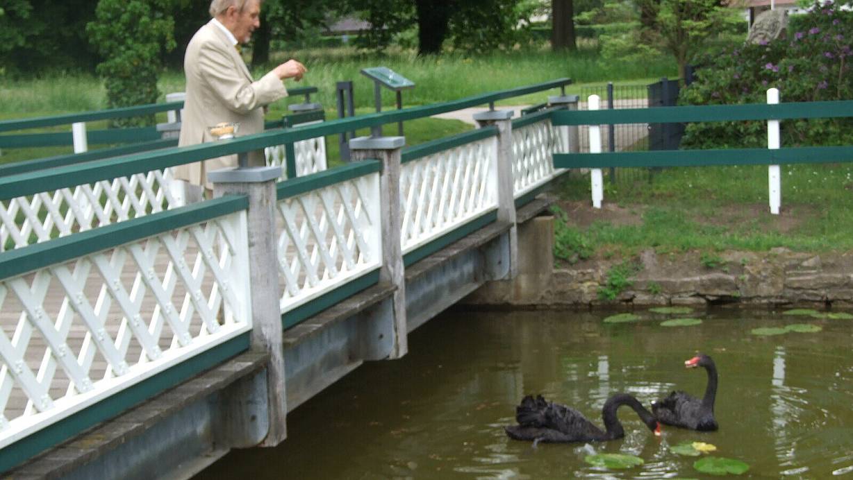 Schlossbesitzer Paul Gauselmann bei seiner täglichen Lieblingsbeschäftigung: er füttert seine schwarzen Schwäne am Schlossgraben in Benkhausen. | © Karsten Schulz