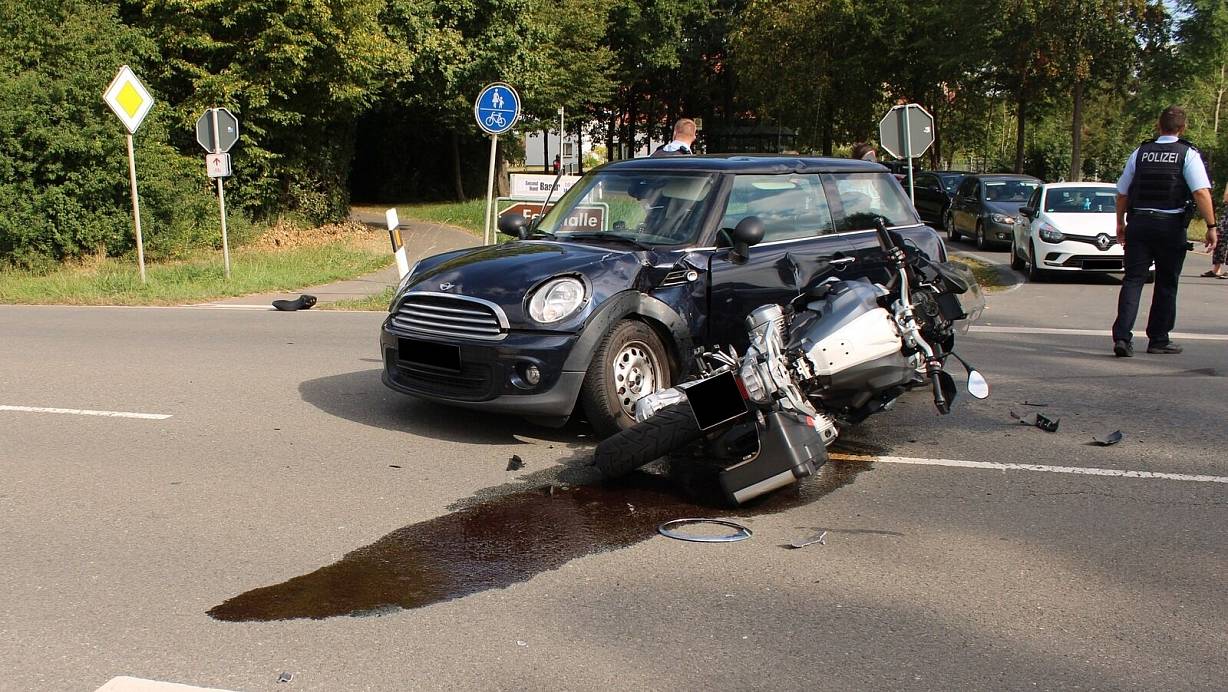 Der Kradfahrer prallte gegen die Fahrerseite des Pkw, wurde in der Folge über die Motorhaube geschleudert und blieb schließlich schwer verletzt auf der Fahrbahn liegen. Ersthelfer kümmerten sich um den Mann und informierten zudem die Rettungskräfte. Nach einer notärztlicher Versorgung an der Unfallstelle brachte eine Rettungswagenbesatzung den 59-Jährigen ins Krankenhaus. Der unter Schock stehende Autofahrer kam ebenfalls in ein Krankenhaus. Nach der Unfallaufnahme durch die Polizei wurden beide Fahrzeuge abgeschleppt. Neben dem Rettungsdienst und der Polizei war auch die Feuerwehr im Einsatz.