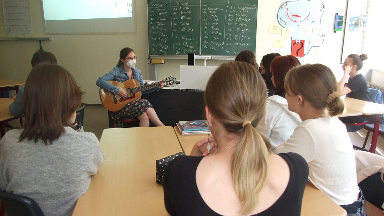 Pädagogin Hedda Schoof gibt Deutschunterricht für ukrainische Flüchtlingskinder am Söerblom-Gymnasium. Sie greift gern zur Gitarre, um so die Sprache intensiver vermitteln zu können. Die Schüler sind mit dem Rücken zur Kamera gekehrt, damit sie aus Sicherheitsgründen nicht zu erkennen sind. | © Karsten Schulz