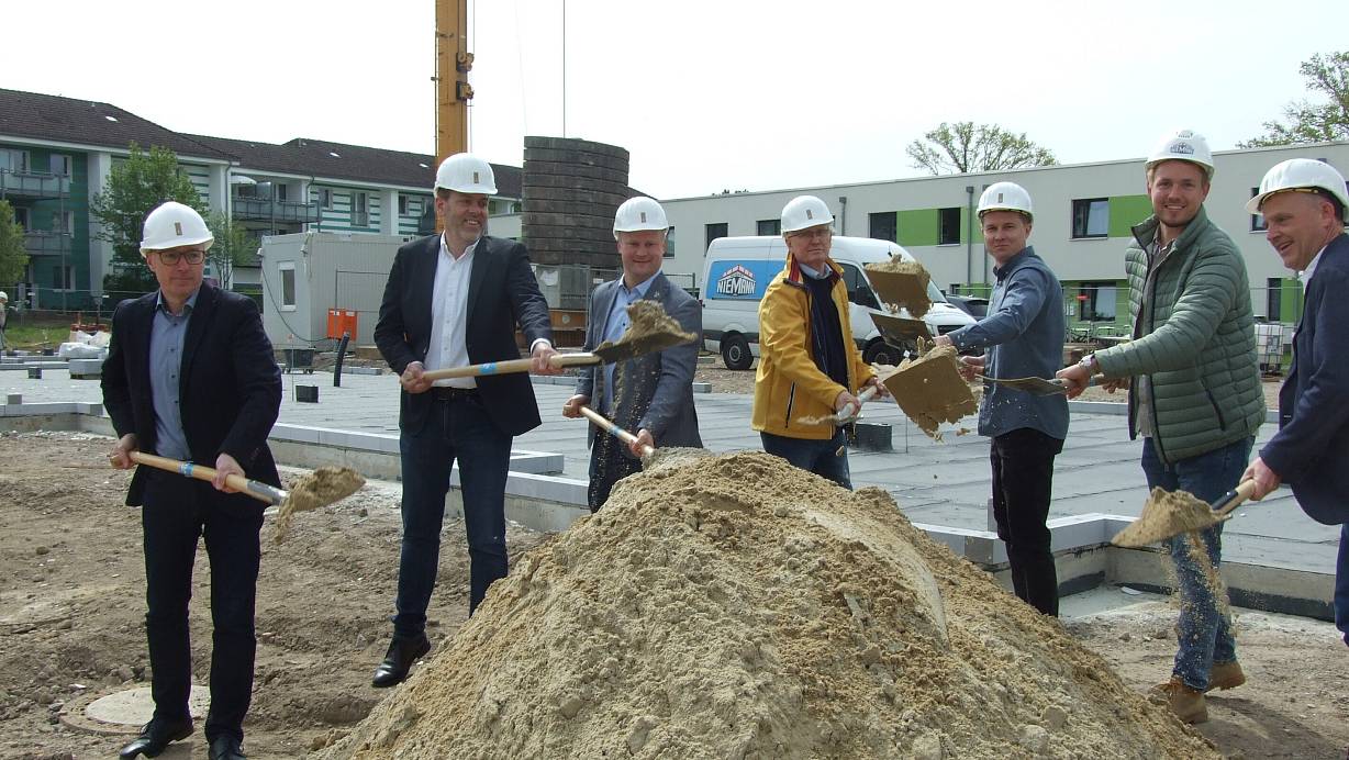 Beim offiziellen Spatenstich waren Klaus Hagemeier (Vorstand Stadtwerke Espelkamp v. l.), Sascha Golnik (Geschäftsführer Aufbaugemeinschaft Espelkamp), Henning Vieker (Bürgermeister Stadt Espelkamp), Andreas Durczok, Andreas Ens (beide Architekten der Aufbaugemeinschaft Espelkamp), Arne Niemann (Baugeschäft Niemann) und Arthur Wall (Ortsvorsteher) dabei. | © Karsten Schulz