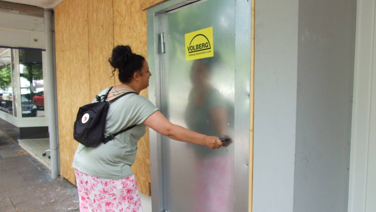Eine Kundin versucht, in den inzwischen verbarrikadierten Eingang des ehemaligen SB-Bank-Centers der Deutschen Bank und der Cash-Group an der Breslauer Straße hineinzukommen. | © Karsten Schulz
