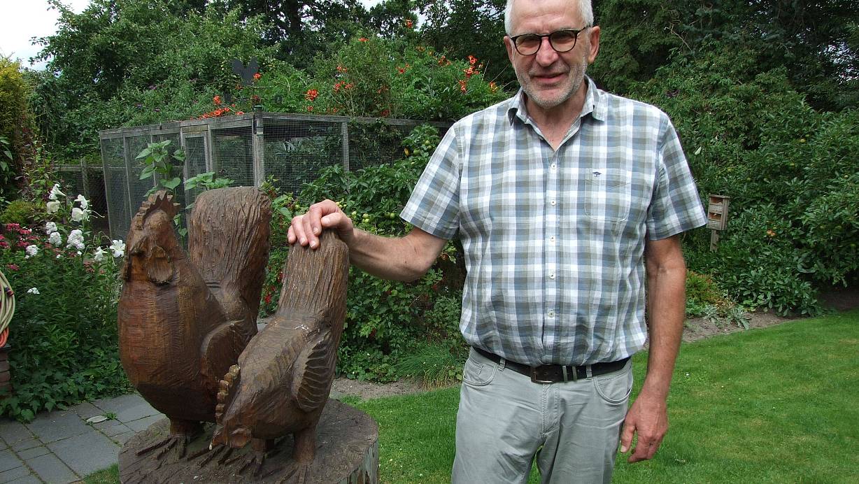 Wilfried Windhorst in seinem privaten Garten in der Altgemeinde vor seiner Holzskulptur. Im Hintergrund ist der große Hühnerstall zu sehen - die Zucht ist eine große Leidenschaft von Windhorst. | © Karsten Schulz